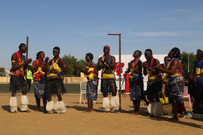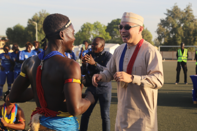 当“勇气”队队长从王大使手中接过冠军奖杯,全场一片欢腾。乍得当地舞者向身着乍得传统服装的王大使和夫人杨楠女士敬献珠串,邀请他们同队员一起跳乍得民间舞蹈。激悦的鼓声回荡在球场内外,喜悦的笑容浮现在队员、来宾和观众脸上,大家击掌相庆、欢欣鼓舞。这一幕,中乍两国的铿锵玫瑰华丽绽放!中乍人民的深情厚谊直抵云霄!