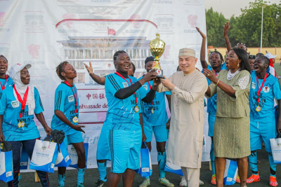 经过一天紧张的赛事,“勇气”队技高一筹,赢得冠军。八支参赛队伍围拢到场上,共同庆祝这个满浸友谊的兴奋时刻。乍得青年和体育部长盛赞中乍友谊:“中国驻乍得使馆为乍得青年和乍中人民搭建了友谊的桥梁,乍得永远是中国的好兄弟、好伙伴,乍中友谊长存!”王大使在致辞中说:“体育是友谊的桥梁,是世界的通用语言,可以让中乍人民增进了解、团结一心。今后‘友谊杯’比赛将继续举办下去,为深化两国友好,推动双边各领域合作发挥积极作用。”